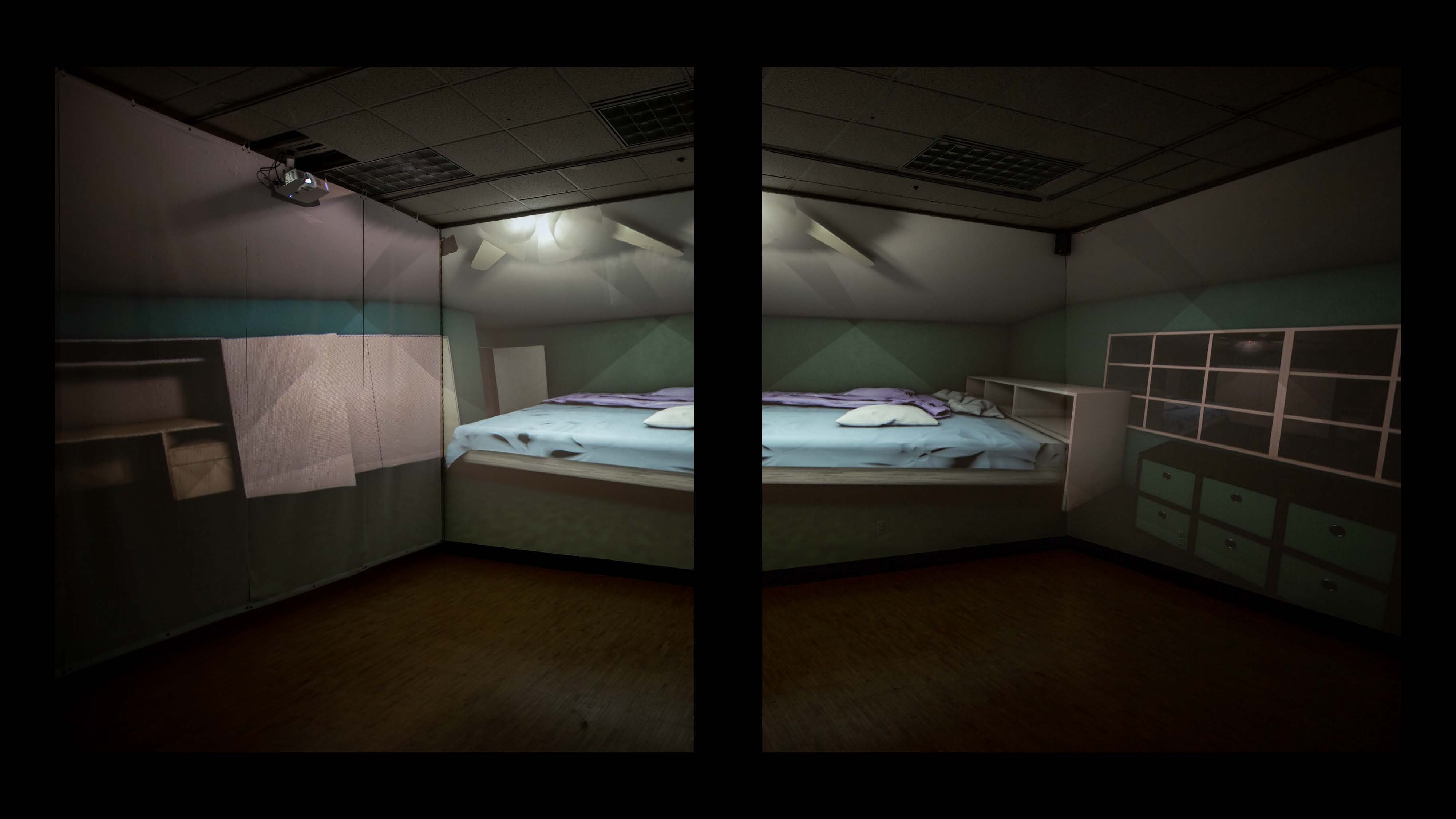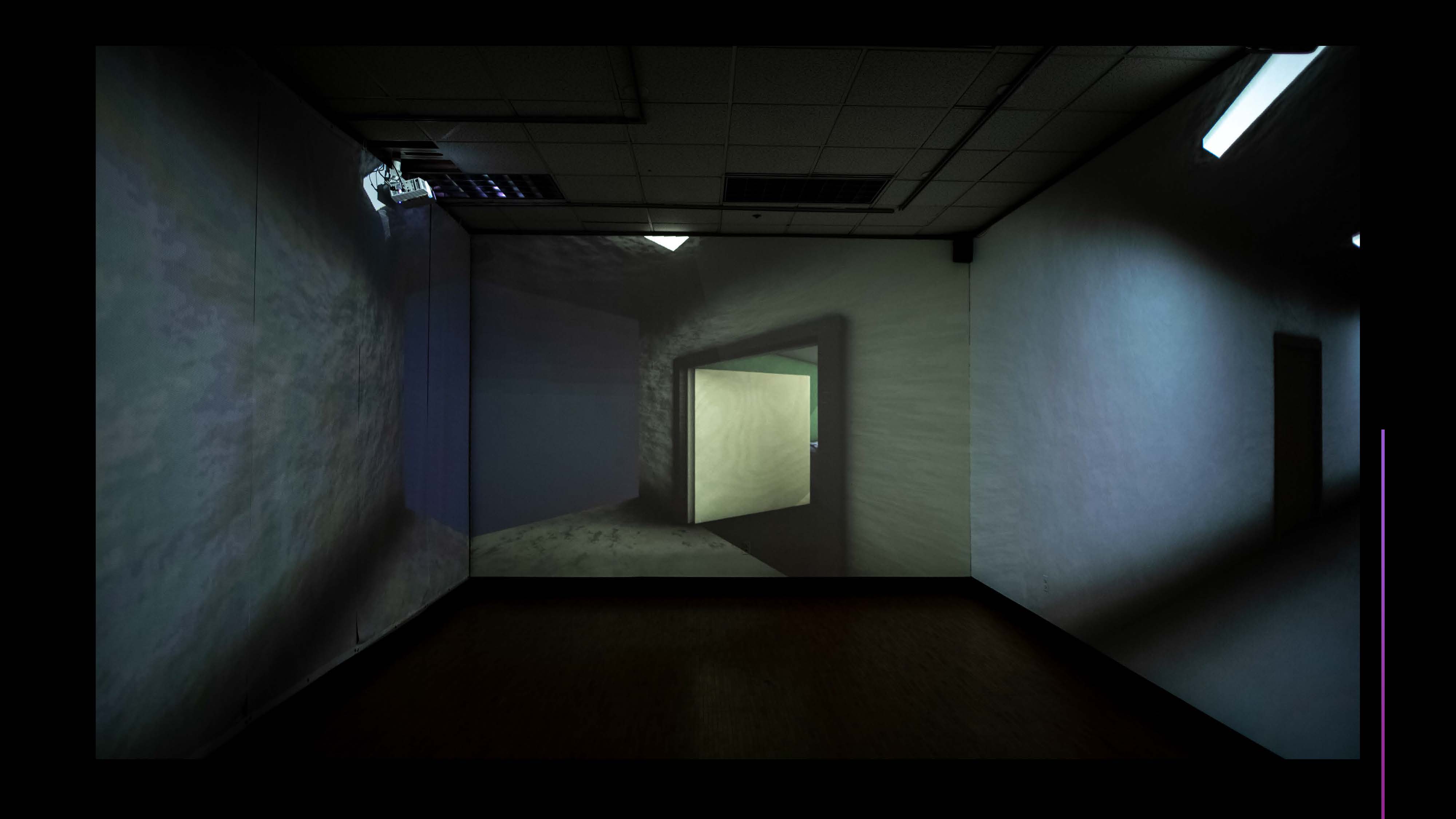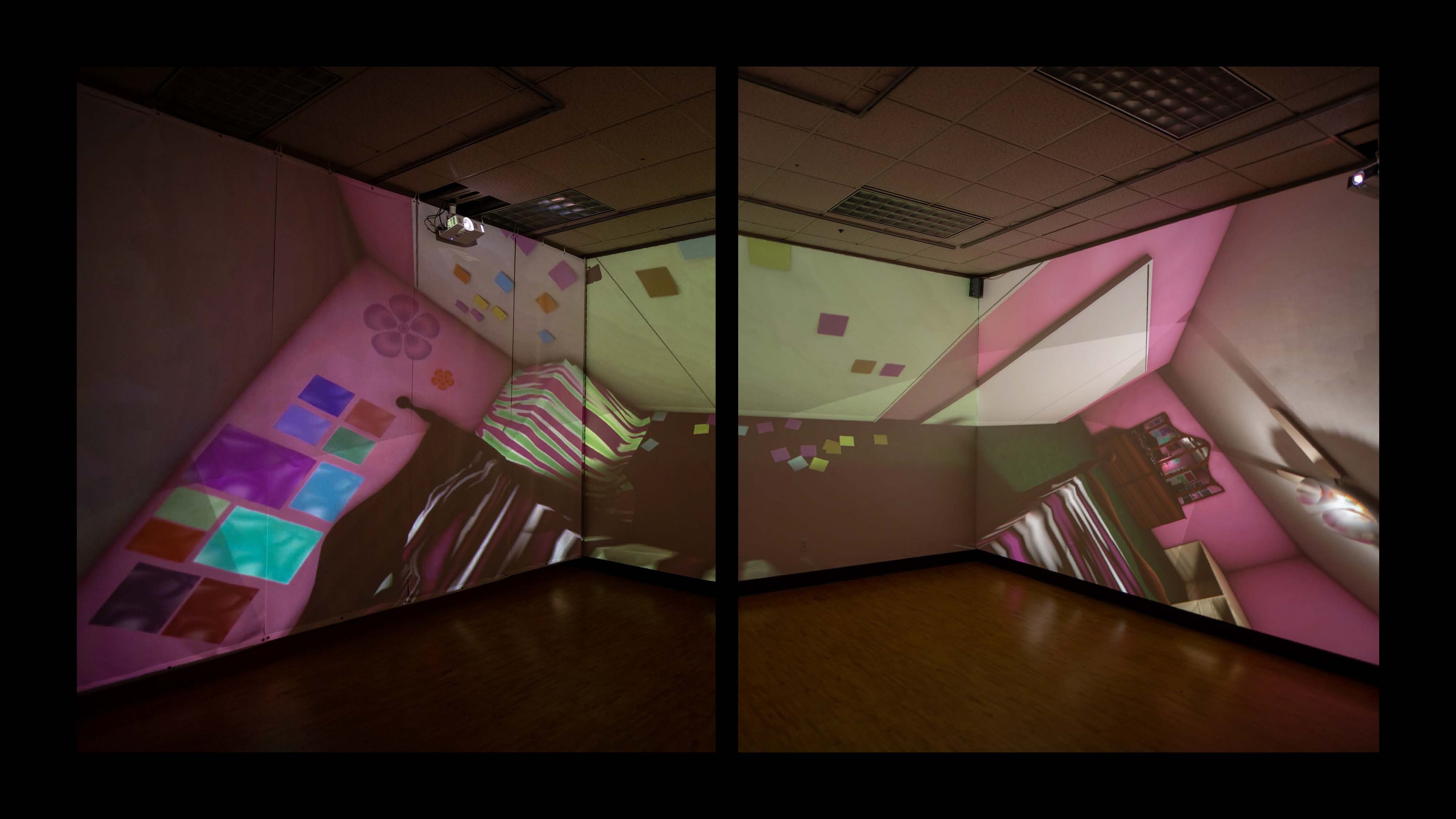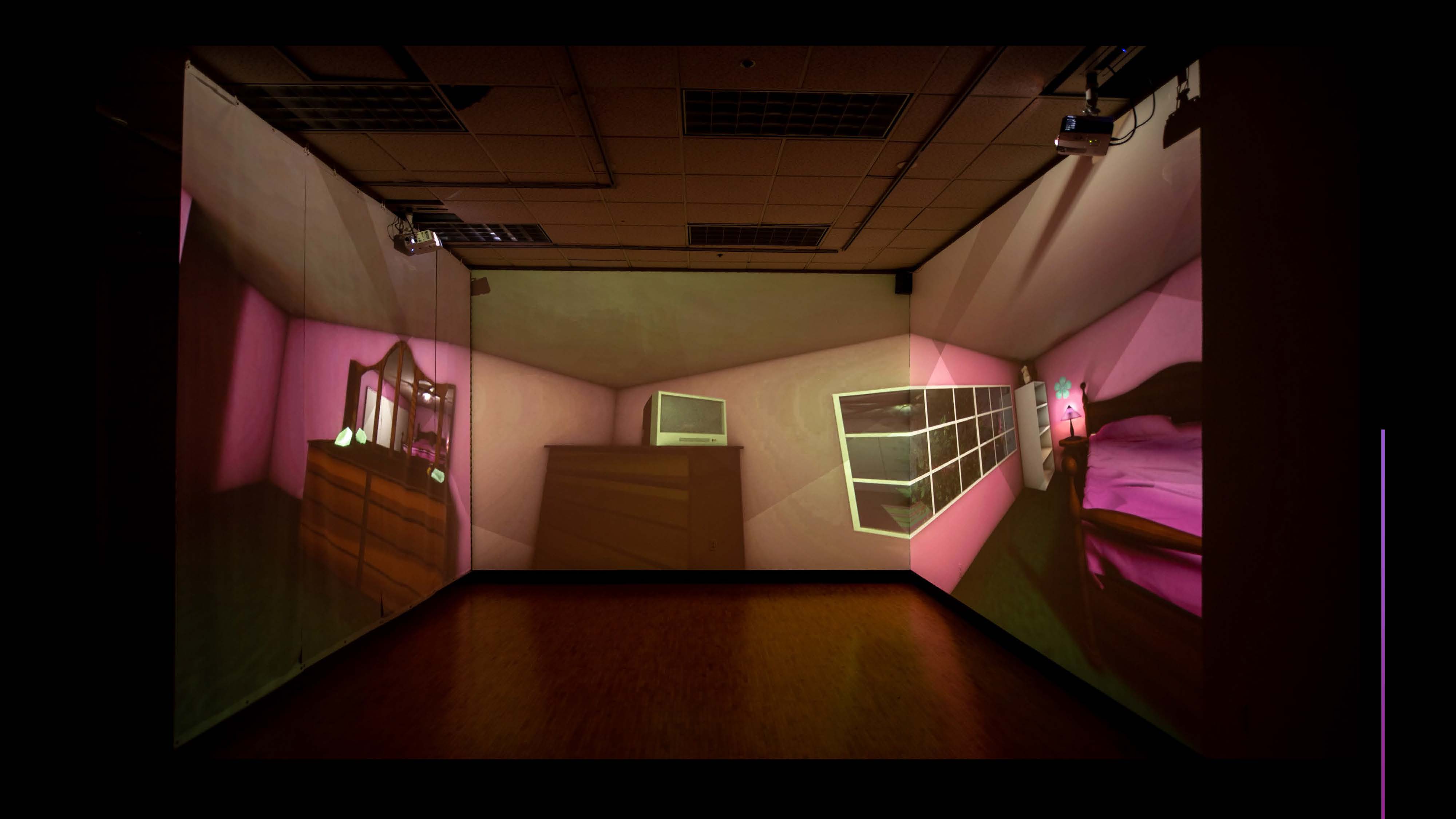 For this exhibition, the piece was shown in both a VR headset, and projected onto two walls and a custom projection screen.