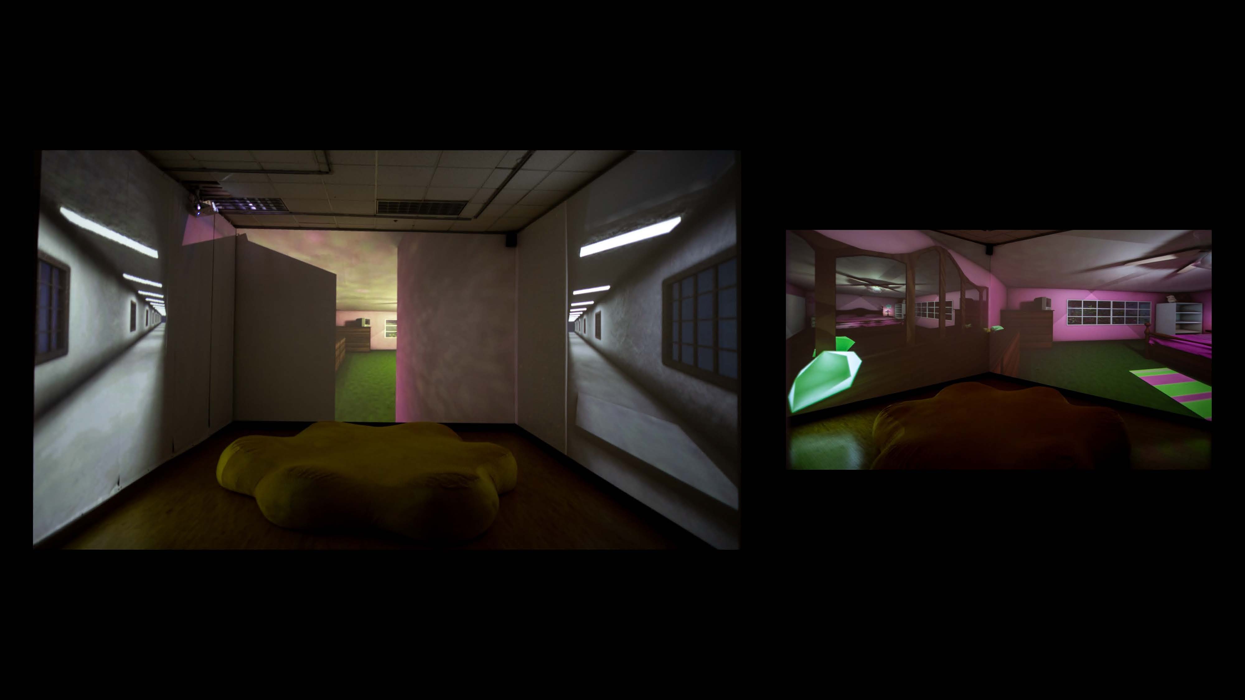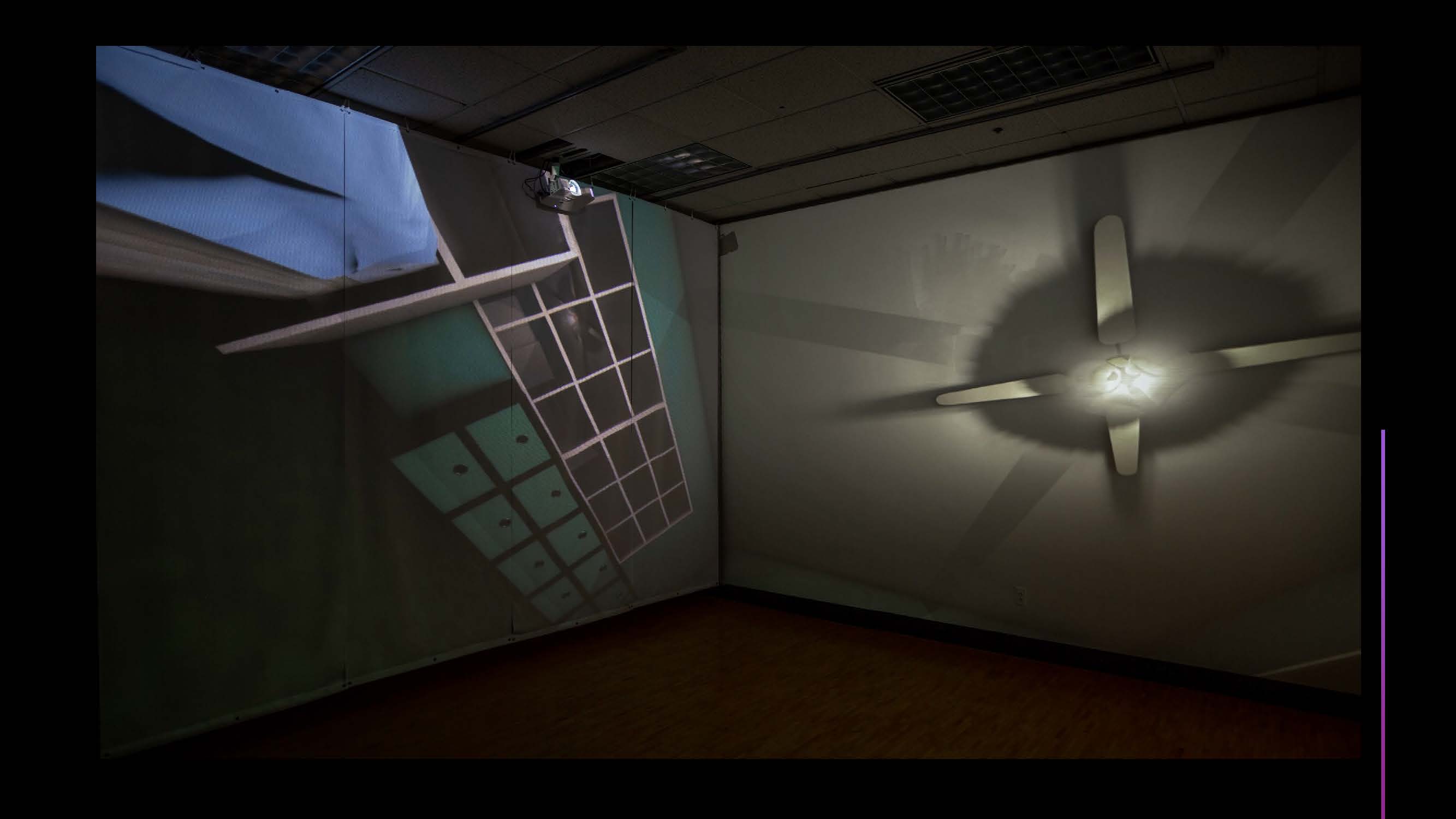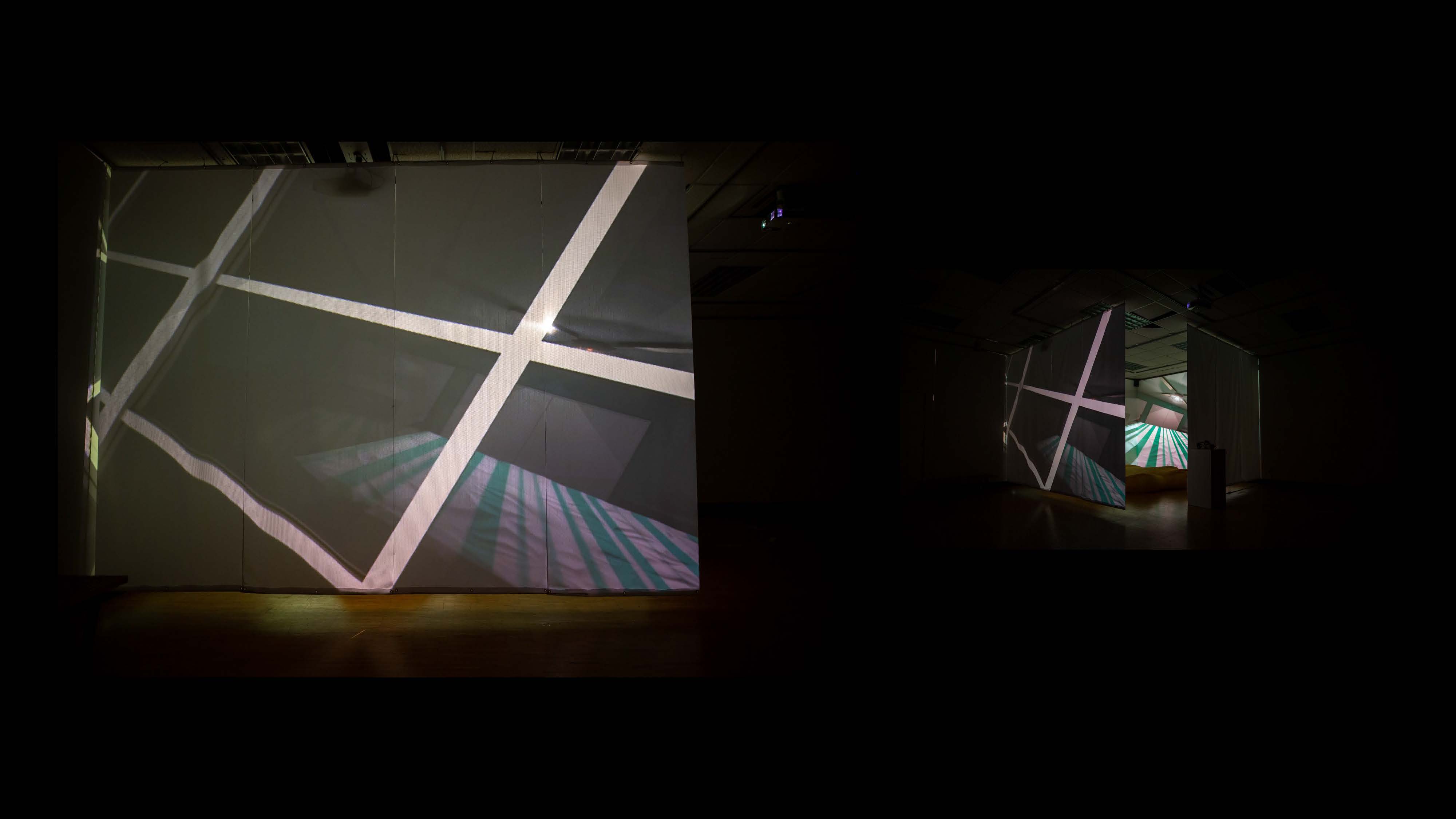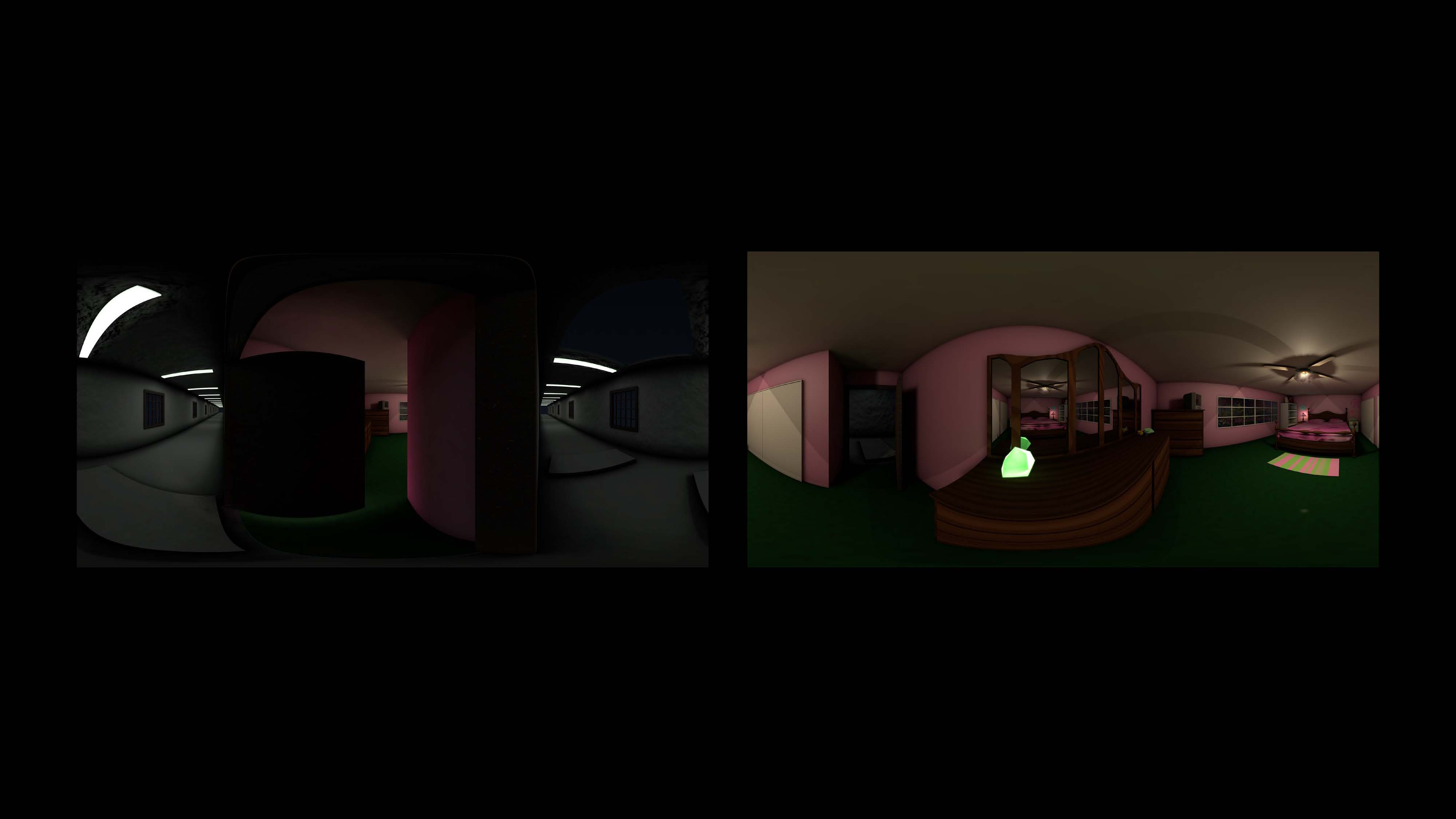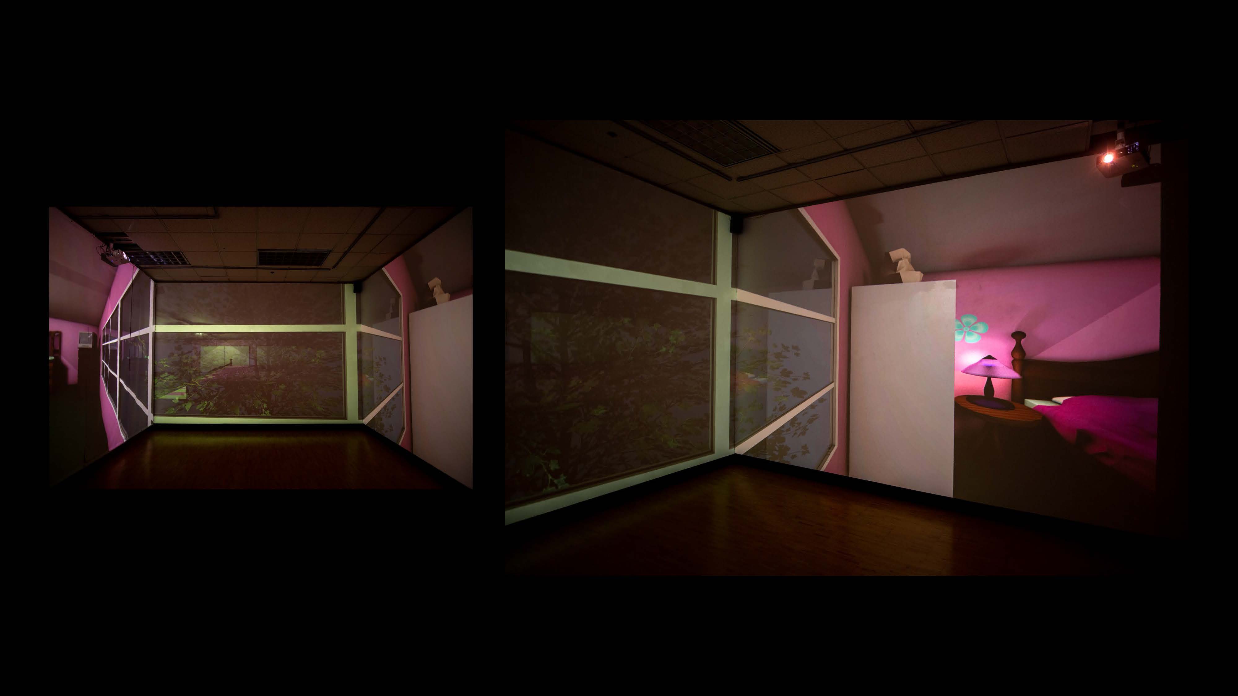 For this exhibition, the piece was shown in both a VR headset, and projected onto two walls and a custom projection screen.